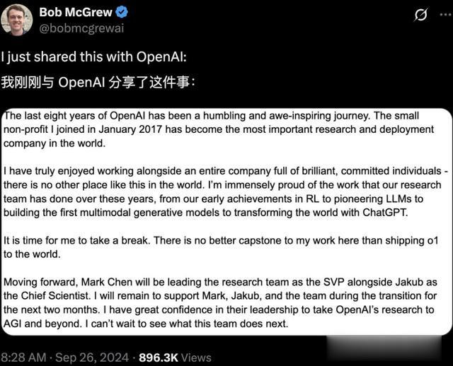 离开之前,他表示发布o1模型是对他在OpenAI最好的「盖棺之作」,接下来他需要休息,并逐步移交工作。