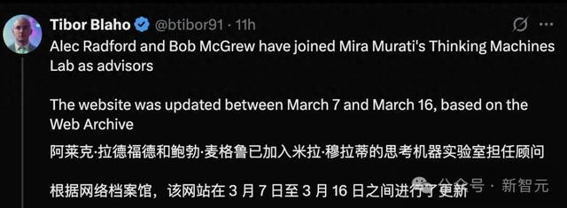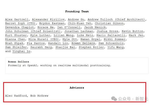 据Thinking Machine Lab官网更新,OpenAI前核心成员Alec Radford和Bob McGrew将担任公司顾问(Advisors)。